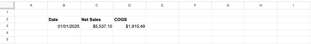 Step 3: Locate your cost of goods sold in the ‘Cost Of Goods Sold By Order’ report in Shopify and add it to your sheet in cell D3: