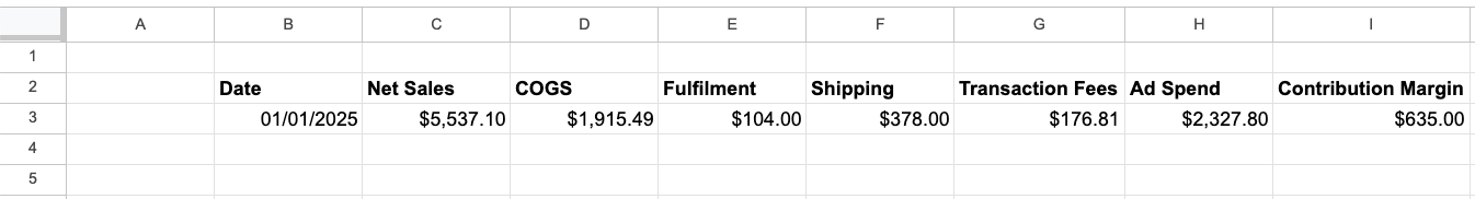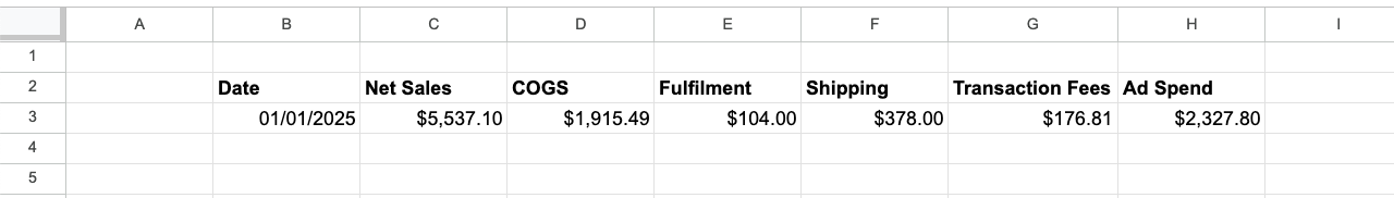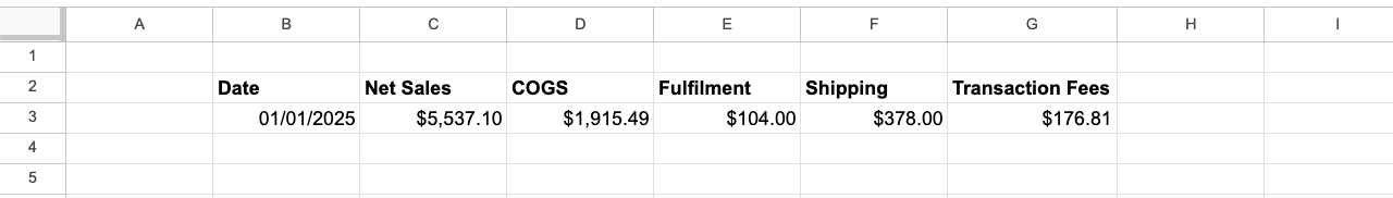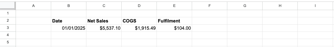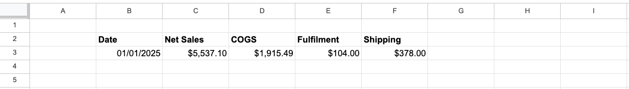 Step 4: Add your fulfilment cost for yesterday’s orders to your sheet in cell E3: