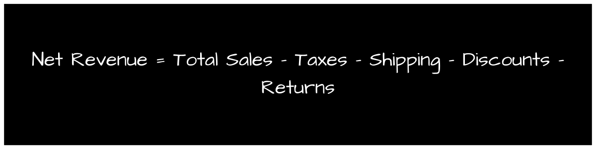 Net revenue is the money that your business actually keeps from each sale. Net revenue is different from the ‘total sales’ figure that is reported in your Shopify dashboard.